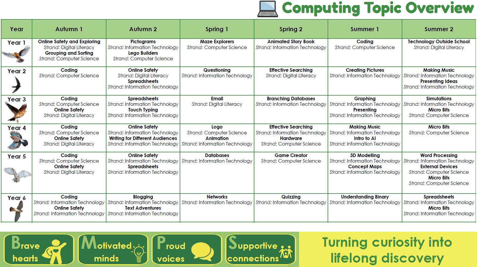 Curriculum ImplementationComputing is taught through a structured curriculum using Purple Mash, which supports the teaching of Computer Science, Information Technology and Digital Literacy. Lessons build on prior learning and help children develop skills in programming, creating digital content and understanding how technology works. Online safety is embedded throughout to ensure pupils learn to use technology safely, responsibly and confidently.