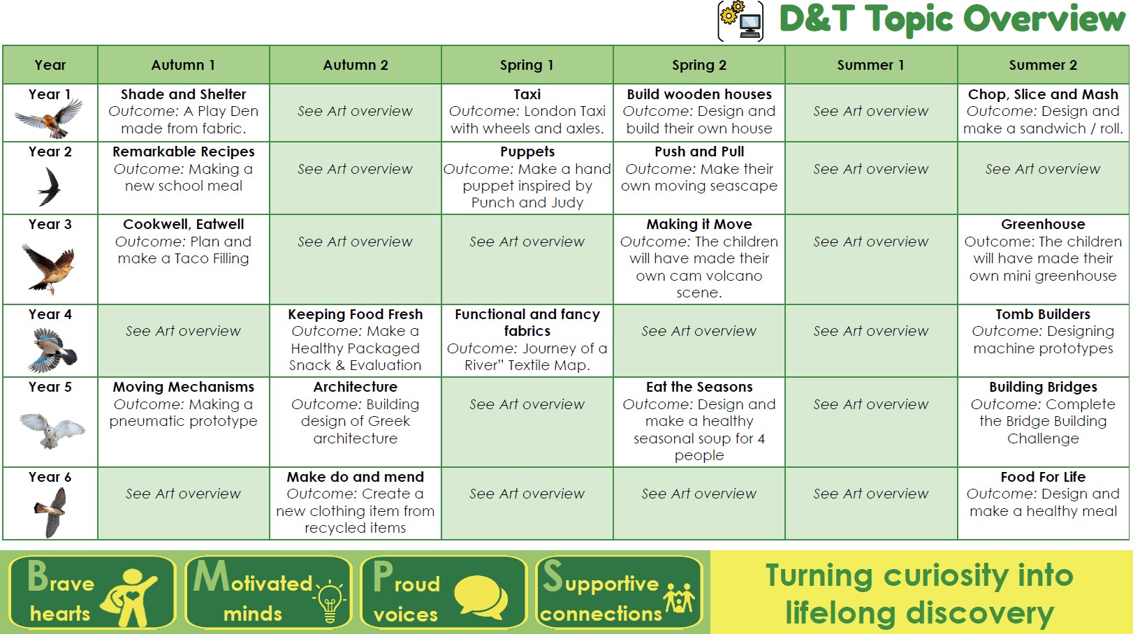 Projects are carefully sequenced and focus on key areas such as structures, mechanisms, textiles, and cooking and nutrition. Children develop their designing, planning, making and evaluating skills through an iterative process, gradually using a wider range of tools, materials and techniques as they progress.