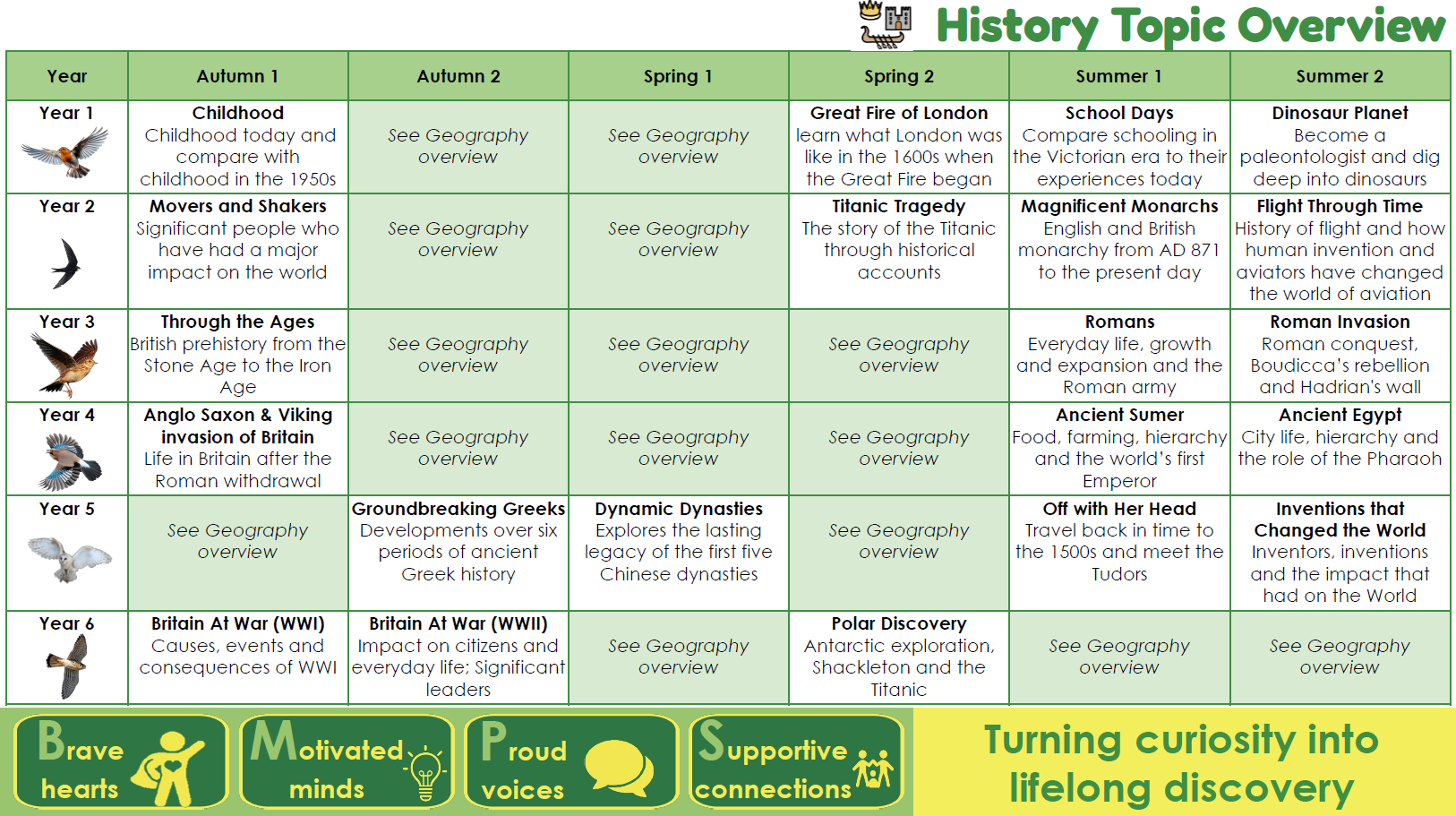 Our History curriculum is designed to ignite children’s curiosity about the past. We are determined that, alongside historical knowledge, there will be a high focus on the development of specific historical skills to ensure children know more and remember more. The history skills and knowledge are then built upon each year, with a clear path of progression through the school.