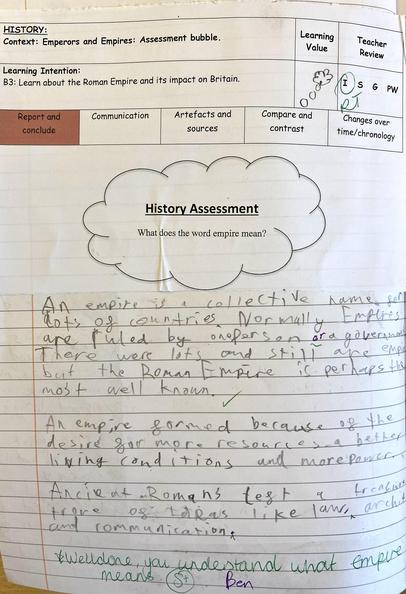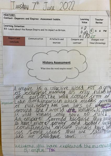 History is assessed through teacher judgement and monitored by the subject leader. Progression grids, and pupil voice, supports teachers in making accurate judgements of what the children know. Pre-assessment tasks, that are continually added to show progression and value added, as well as assessment bubbles are used to make a judgement about each child’s attainment. This is then reported to parents within each child's end of year report.