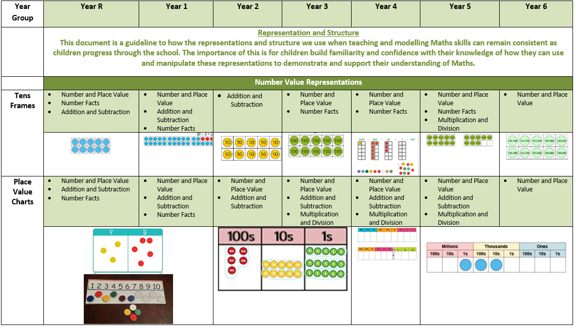 Our 'Representations and Structures' progression document ensures strong and appropriate structures are being used within our teaching, allowing children to gain a secure understanding of new mathematical concepts. Progression of these representations through the year groups, provides familiarity and consistency for the children, providing them with confidence and understanding of how to manipulate these structures to support their learning.