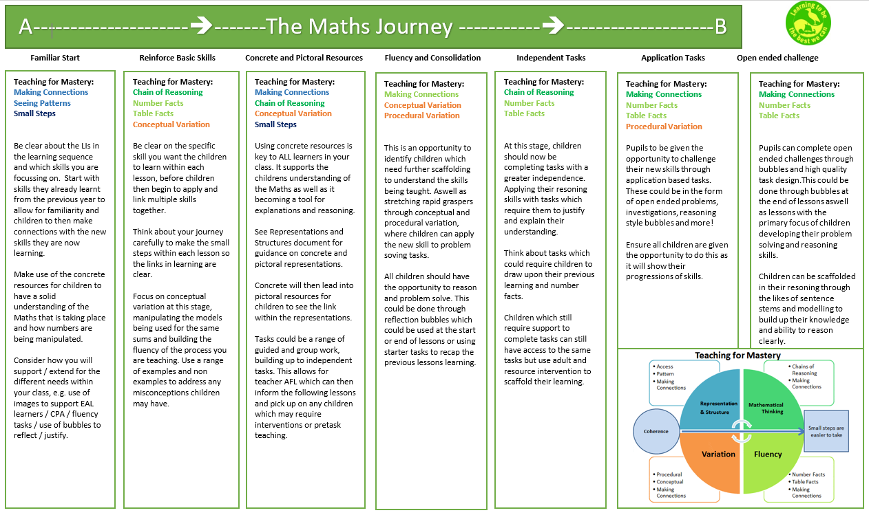 A clear sequence of learning is mapped out through our A2B teaching document. This sequence integrates the key ideas of teaching for mastery, making links and building upon children's prior knowledge. We plan for lots of opportunities for active learning. This includes encouraging the children to verbalise what they are doing and why, tackling a range of tasks involving practical investigations and problem-solving, applying their knowledge and skills to tasks within mathematics and other curriculum areas. Teachers’ expectations are high and matched to the ability and experience of individual children.