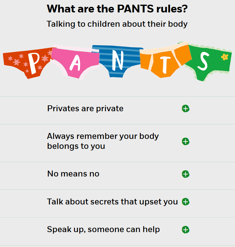 Children are taught in an age-appropriate way that the parts of their bodies covered by underwear are private. These areas are not for other people to see or touch. They are also encouraged to talk to a trusted adult if anything happens that makes them feel upset, worried, or uncomfortable.