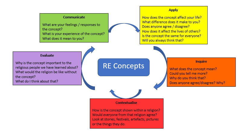 R.E. is taught through concepts at Bitterne Manor Primary School using a cycle of enquiry.  The cycle starts at either Enquire or Communicate.